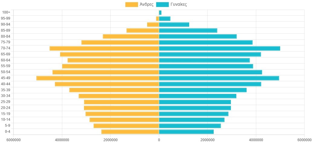 • Στον οριζόντιο άξονα απεικονίζεται το σύνολο των ατόμων σε μια δεδομένη χρονική στιγμή. Πιο συγκεκριμένα, στα δεξιά του κάθετου άξονα απεικονίζονται οι γυναίκες και στα αριστερά οι άνδρες.