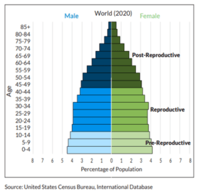 Παρακάτω βλέπουμε και πάλι την πληθυσμιακή πυραμίδα του παγκόσμιου πληθυσμού κατά το έτος 2020. Ωστόσο αυτή τη φορά, οι ηλιακές ομάδες είναι χωρισμένες ανάλογα με την κατηγορία αναπαραγωγής που ανήκουν.