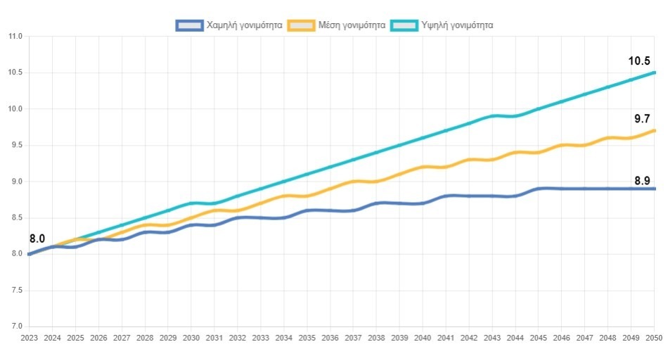 – Και τα τρία σενάρια έχουν αυξανόμενη πορεία μέχρι το 2050 από το 2023? (ναι έχουν ανάλογα την τάση γονιμότητας)