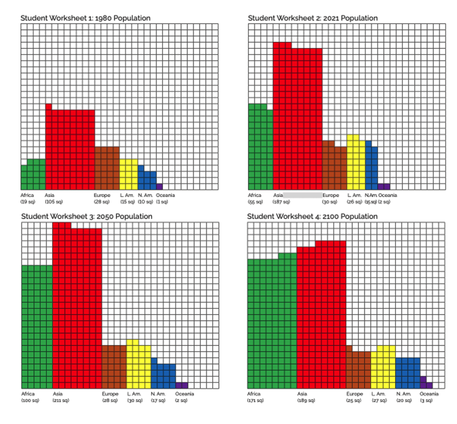 Οι μαθητές/τριες μοιράζονται σε ομάδες των 4 και παίρνουν από 1 φύλλο εργασίας που έχει τον πληθυσμό κατά περιοχές από το 1980 μέχρι το 2021 και προβλέψεις για το 2050 και 2100. Κάθε ομάδα παίρνει και από 1 σετ μαρκαδόρους από τα υλικά (ή έχει διαθέσιμα χρωματιστά φόντα ψηφιακά). Οι μαθητές/τριες χρησιμοποιούν όλοι ίδιο χρώμα για κάθε ήπειρο όπως φαίνεται και στο φύλλο εργασίας. Οι μαθητές/τριες θα δημιουργήσουν ραβδογράμματα χρησιμοποιώντας τις πληροφορίες, τα χρώματα και τα πλέγματα των φύλλων εργασίας.
